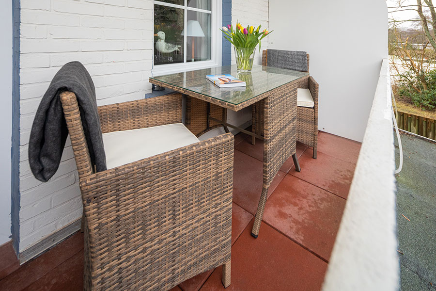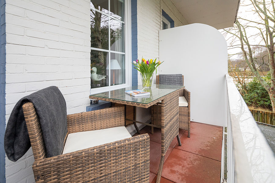 Auf ein feststehendes Bett und den damit verbundenen Hotelzimmercharakter wurde bewusst verzichtet. Sie schlafen auf einem bequemen Schlafsofa (150x200 cm). Die Handhabung ist ganz einfach. Die Bettwäsche verbleibt tagsüber in der dafür vorgesehenen Tischtruhe. Die Südausrichtung der Wohnung gewährleistet einen Blick auf den angrenzenden Kurpark. Beim Aufenthalt auf dem Balkon werden Sie die ruhige Lage der Wohnung schätzen lernen.