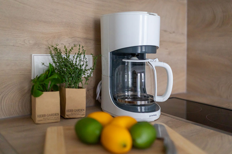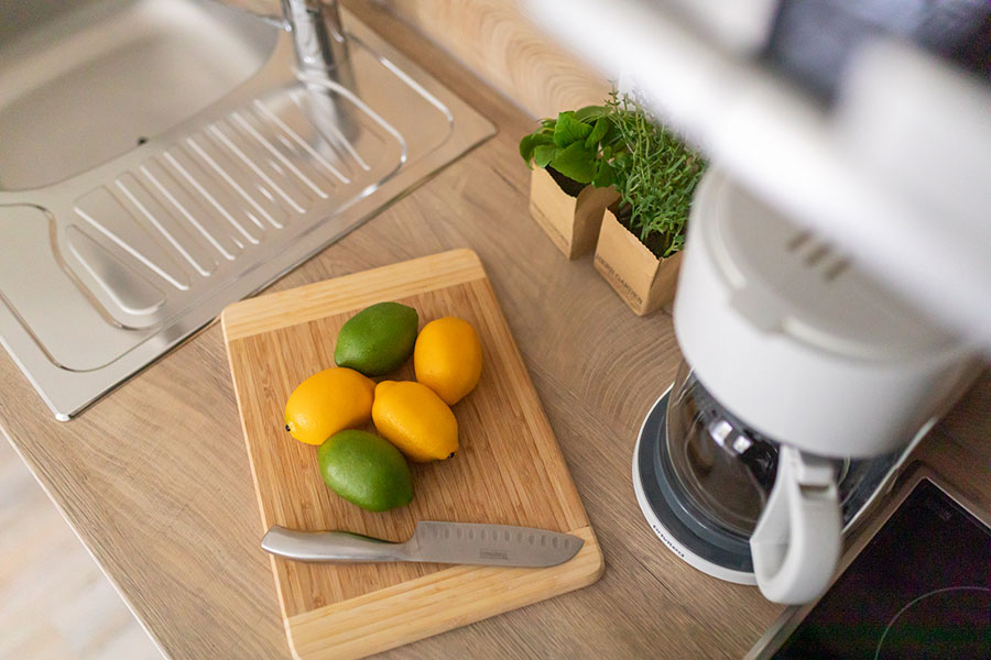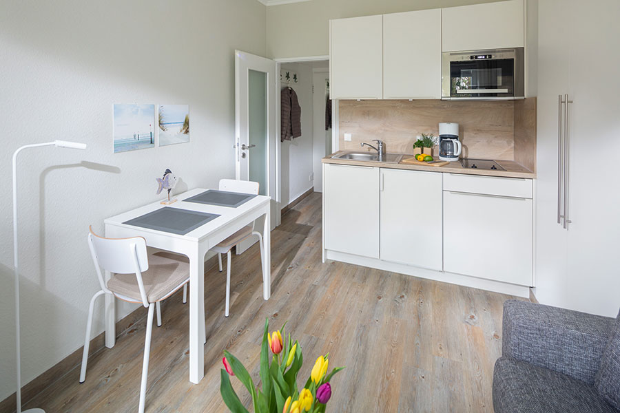 Die renovierte und komplett ausgestattete kleine Einbauküche verfügt über ein 2er-Cerankochfeld und einem Mikrowellenherd. Die Küche ist darüber hinaus mit den üblichen Elektrokleingeräten (Kaffeemaschine, Wasserkocher, Eierkocher etc.) ausgestattet. Außerdem stehen ausreichend Kochgeschirr, Porzellan, Gläser und Besteck zur Verfügung.