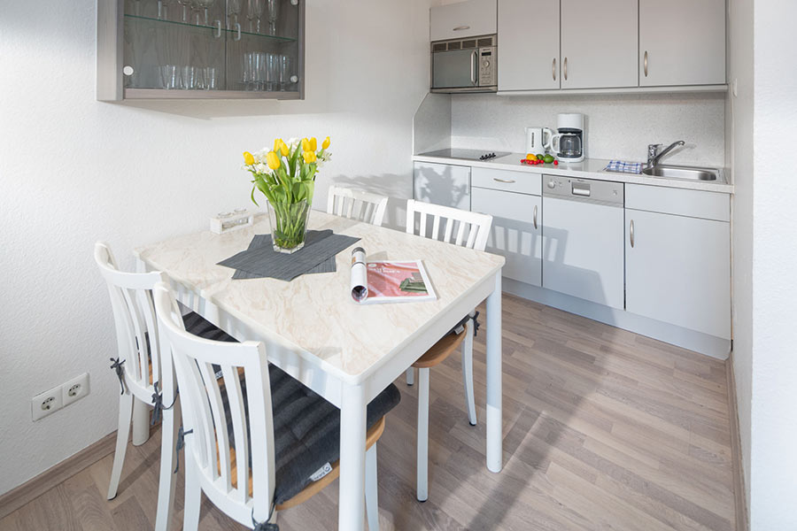 Die Küchenzeile beinhaltet Mikrowelle, 4er Cerankochfelder, Geschirrspüler, Toaster, Wasserkocher, Kaffeemaschine und Kühlschrank mit 3-Sterne-Gefrierfach. Es stehen ausreichend Kochgeschirr, Pfanne, Porzellan, Besteck und Gläser zur Verfügung.