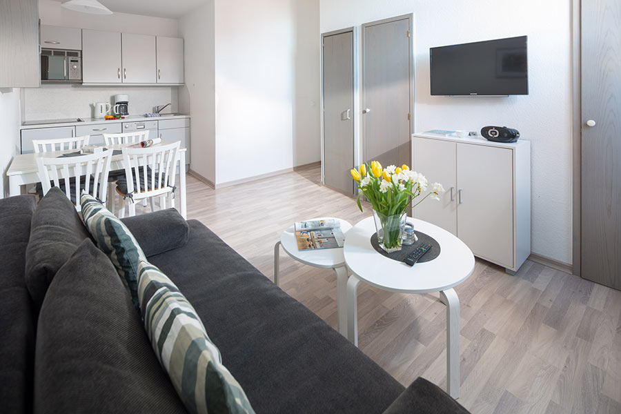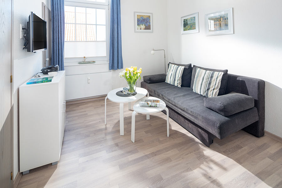 Die Wohnung, bis auf das Duschbad, ist mit Laminat ausgelegt. Durch den Flur gelangen Sie in das Duschbad und den Wohnraum mit angrenzendem Kajütenschlafzimmer. Das Kajütenschlafzimmer verfügt über ein Doppelbett, 160 x 200 cm und Kleiderschrank. Auf der gemütlichen Couch können Sie entspannen und sich von den Unternehmungen des Tages erholen.