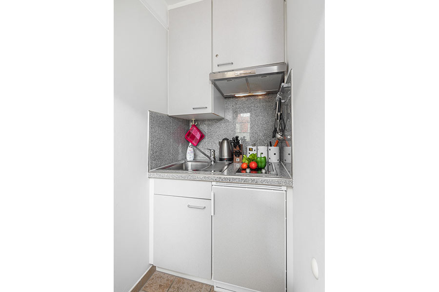 Die Küchenzeile beinhaltet, 2er Cerankochfelder, Toaster, Wasserkocher, Kaffeemaschine und Kühlschrank mit 3-Sterne-Gefrierfach. Es stehen ausreichend Kochgeschirr, Pfanne, Porzellan zur verfügung.