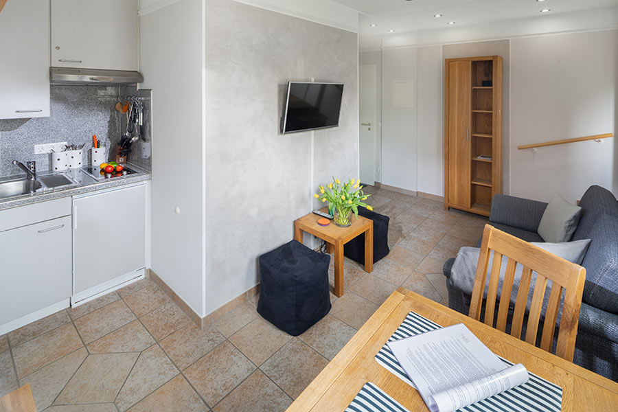 Im Wohnraum befindet sich das bequeme Sofa mit Couchtisch, Flatscreen TV und kleiner Musikanlage, sowie der Esszimmertisch mit Stühlen und eine Garderobe mit großem Spiegel.