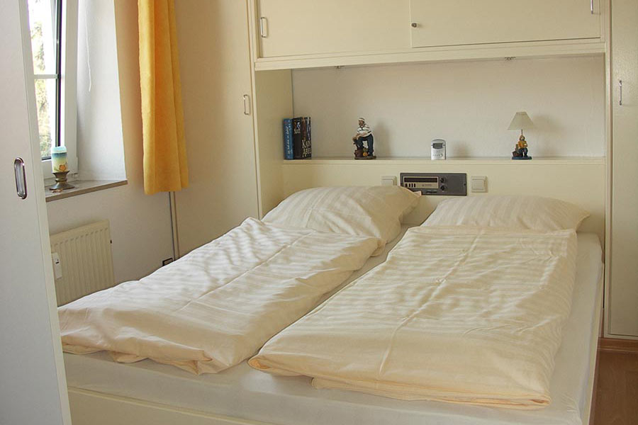 Das Schlafzimmer mit Doppelbett und Schränken ist durch eine Schiebetür vom Wohnzimmer abgeteilt.