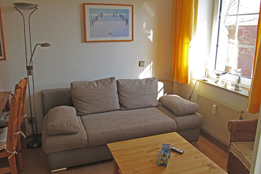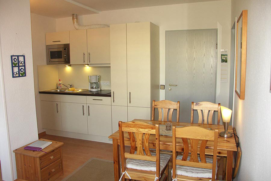 Das Wohnzimmer ausgestattet mit gemütlicher Couch, Couchtisch, Radio mit Weckfunktion, Flachbild-TV, Esszimmertisch und Küchenzeile. In der neuen Küchenzeile finden Sie ausreichend Geschirr, Kochgeschirr, Besteck und Gläser, sowie Mikrowelle, Kaffeemaschine, Wasserkocher und 2er Induktionsherd.