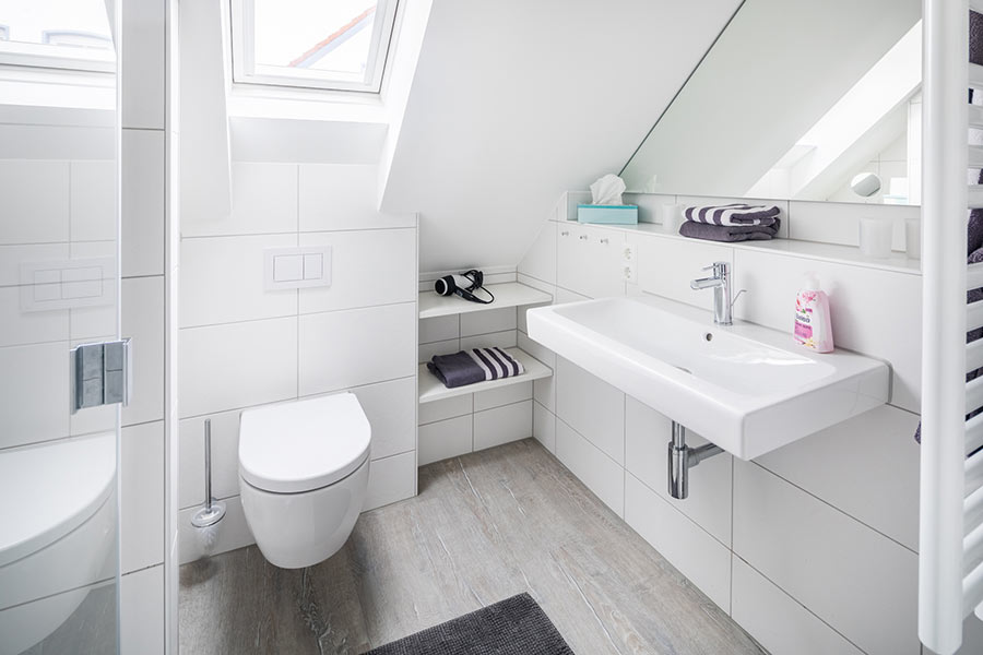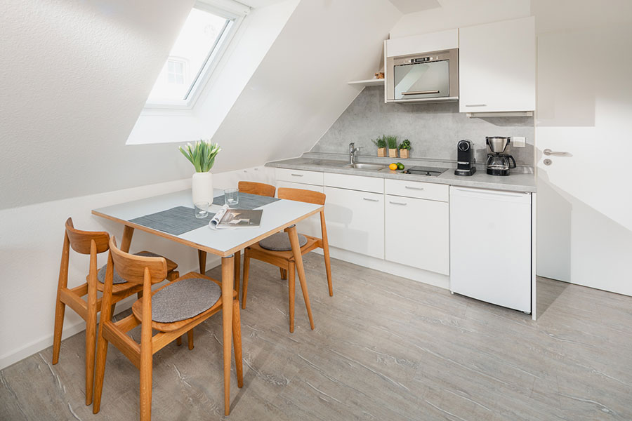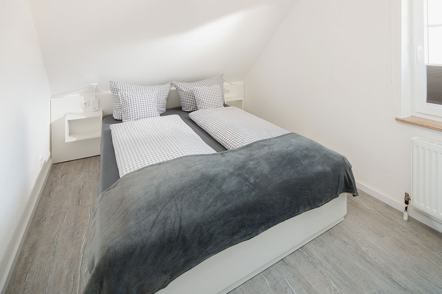 Im Dachgeschoss befindet sich diese 3-Raum-Ferienwohnung. Auf dieser Etage befindet sich nur noch eine weitere Ferienwohnung und somit ruhig gelegen.