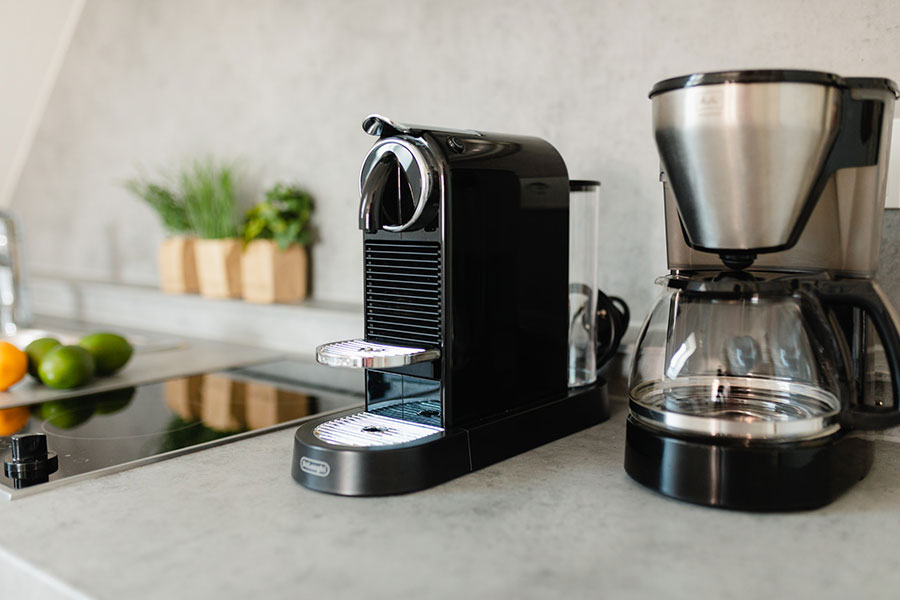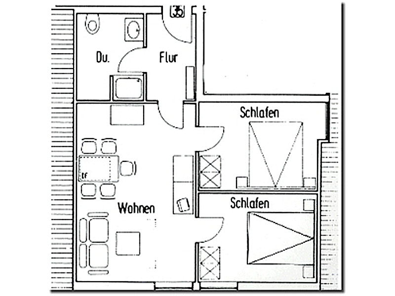 Vom Flur mit Garderobe aus gehen Sie in das Badezimmer und in den Wohnraum. Von dort aus in die zwei Schlafzimmer mit Doppelbetten und Kleiderschränke. Im großen Wohnraum befindet sich die Sitzgruppe mit zwei Sofas und Coachtisch, Esszimmertischund die Küchenzeile. Für die Zubereitung der Speisen oder des Frühstücks sind Mikrowelle mit Abzughaube und ein 2er Kochplattenherd vorhanden. Ein Kühlschrank mit 3 - Sterne -Gefrierfach, ausreichend Kochgeschirr, Geschirr, Gläser, Besteck, ein Toaster, ein Mixer, eine Kaffeemaschine, Nespresso Kaffeemaschine und ein Wasserkocher vervollständigen die Ausstattung.