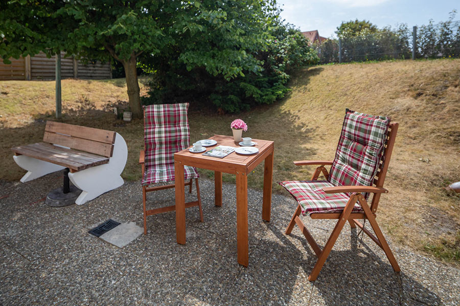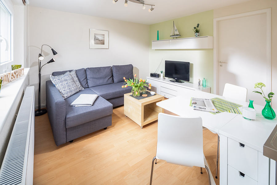 Die Ferienwohnung verfügt über einen Flur, ein Schlafzimmer mit Doppelbett, 160 x 200 cm, und ausreichend Kleiderschrank, ein Wohnraum mit Pantryküche, Esszimmertisch und Stühle, eine bequemes L-Sofa und Couchtisch. Für die Kurzweil steht eine kleine HIFI-Anlage sowie Kabel-TV zur Verfügung. Zur Ausstattung des hellen Duschbads gehört auch ein Fön. Entspannen, klöönen, frühstücken können Sie auf Ihrer Terrasse.