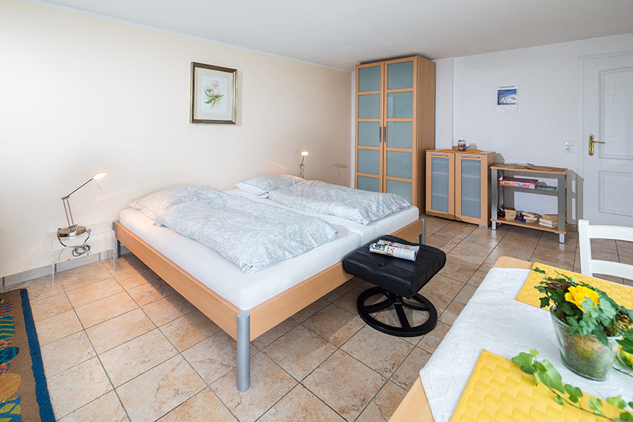 Im Wohn / Schlafraum befindet sich ein Doppelbett, 200 x 200 cm, ausreichend Kleiderschrank, zwei bequeme Sessel und noch ein Esszimmertisch mit Stühle. Für Kurzweil sorgen Kabel TV und ein Radio mit CD-Player.
